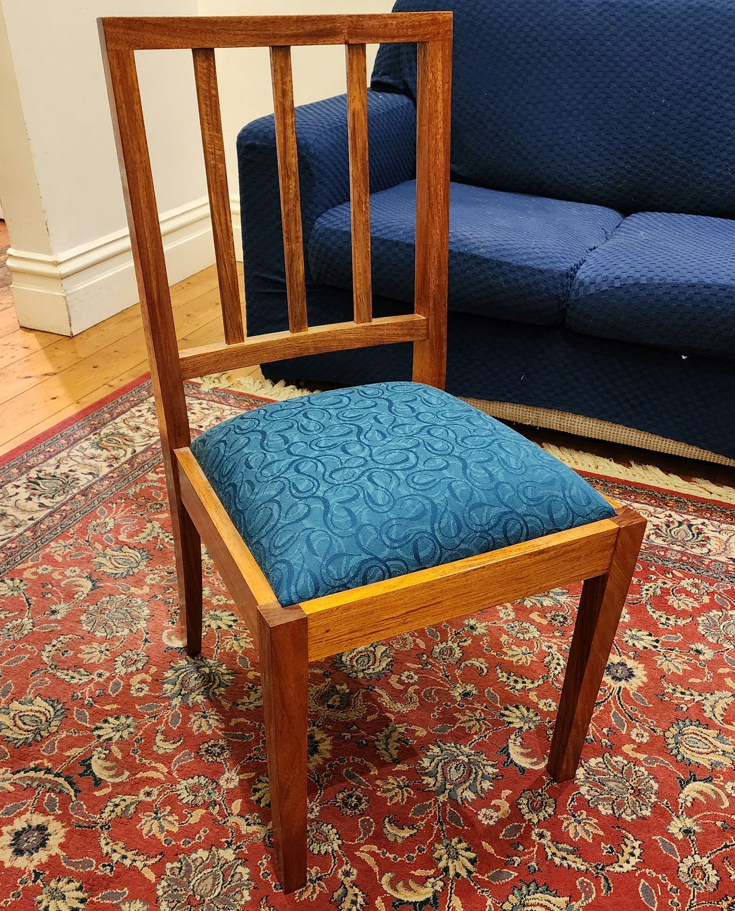 Timeless & classic chair built from Rosewood. Hand upholstered with a deep blue tactile patterned fabric.